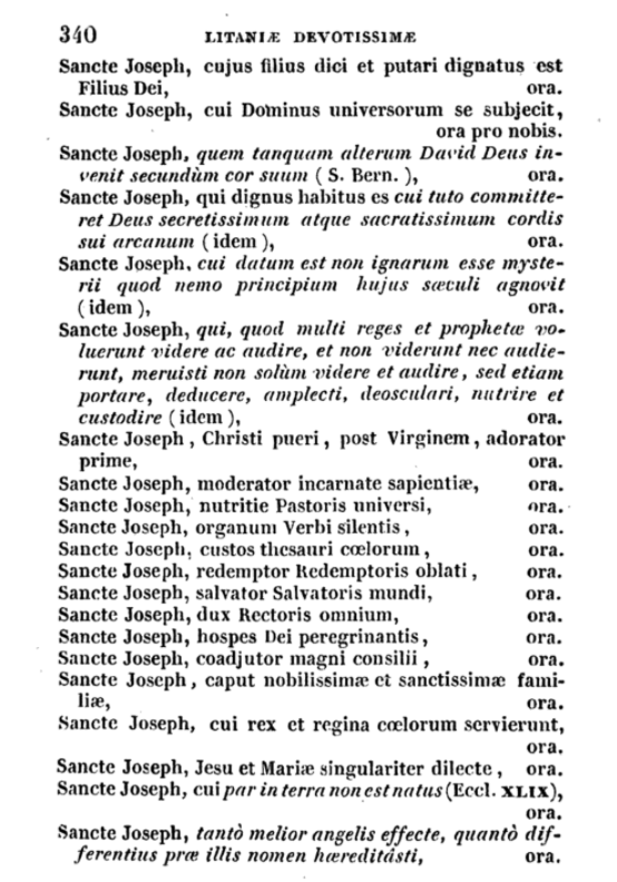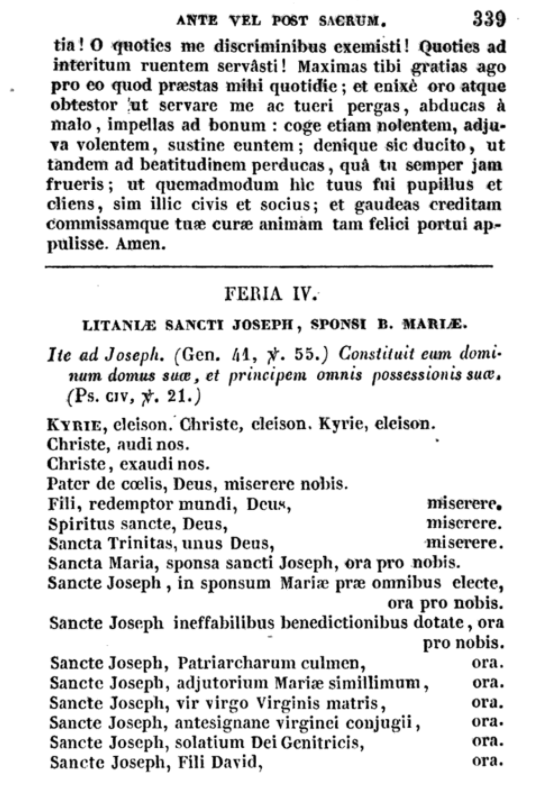 A continuación podemos ver las páginas de un ejemplar similar al citado aunque algo posterior. La feria IV (miércoles) tiene las letanías de San José y otras antífonas y oraciones al Santo Patriarca con la idea de que sirvan para recitar antes o después de oficio o la misa.