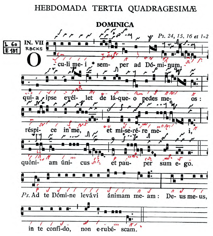 Semper es la palabra más importante. Acordémonos del III domingo de Adviento, cuando la primera parte del introito Gaudete nos dirigía en una especie de crescendo también a la palabra semper. Gaudete in Domino semper. El III domingo de Adviento nos llamaba a regocijarnos siempre en el Señor. Este III domingo de Cuaresma nos invita a mantener los ojos, la mirada, siempre en el Señor. Esta palabra es el punto culminante de la primera semifrase. Tras ese semper intensificado, muy especialmente en el códice de Laon, decimos ad Dominum en un ambiente mucho más fluido y a la vez relajado; pero como si aún escucháramos resonar la palabra semper.